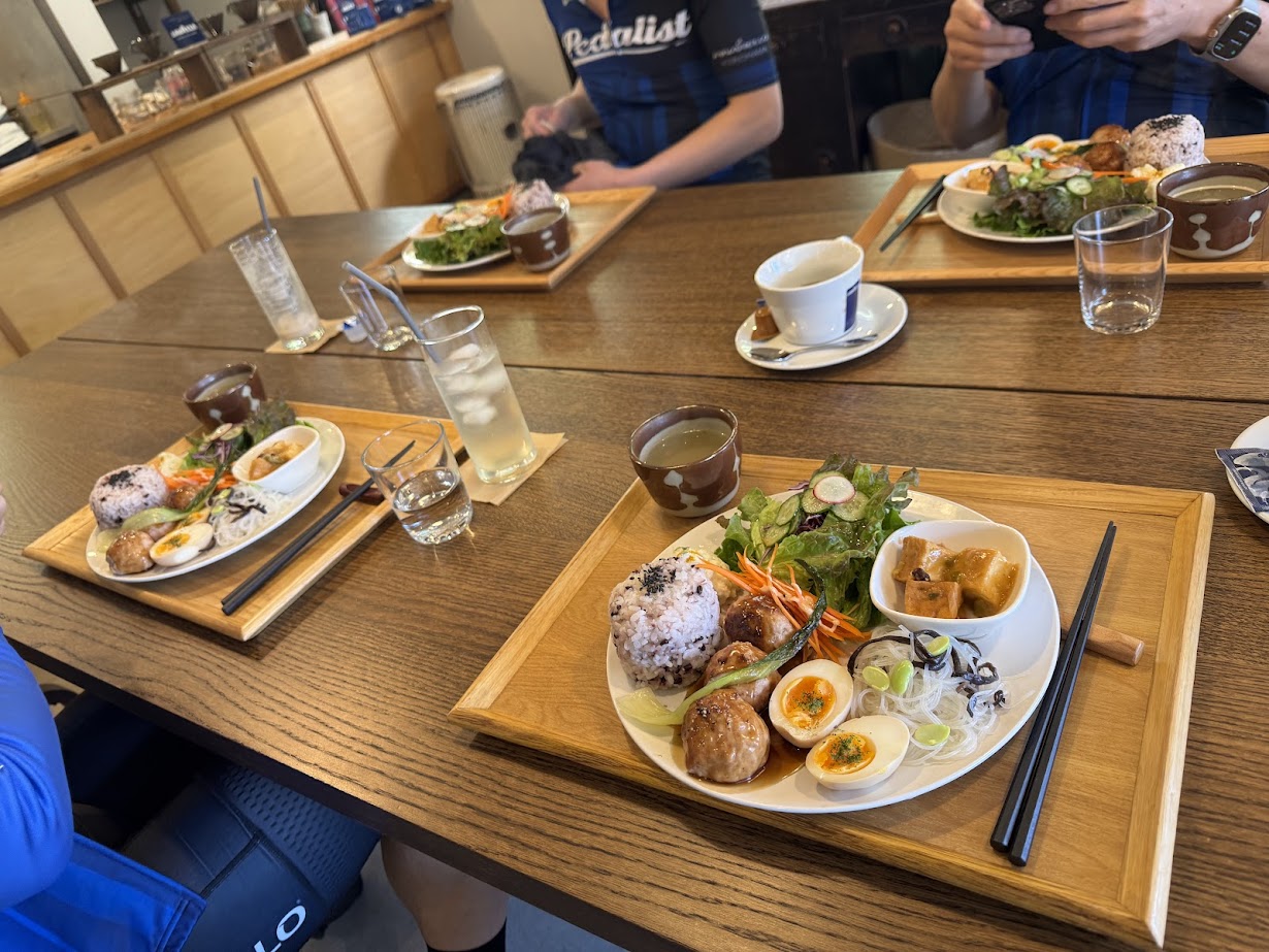 古民家風の外観でお洒落な雰囲気のカフェ。サイクリストには嬉しいサイクルラックも置いてあるので、気軽に入店しやすいです。 私たちの他にもサイクリストの方の来店もありました。