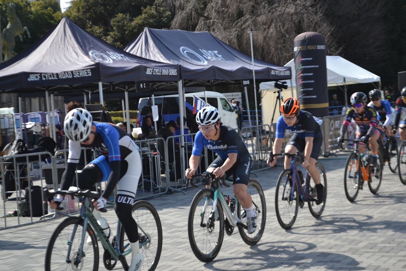スタートライン最前列にペダリスト3名が並ぶことが出来ました。一人で並ぶことが多いので、いつもより緊張が和らぎました。