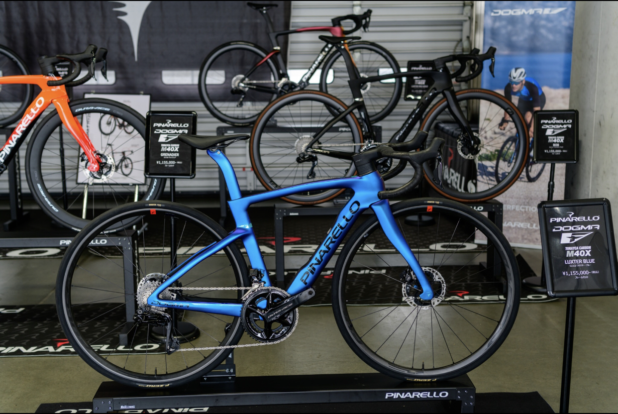 発表されて間もない新型ドグマF。全国から集まるピナレロファンにお披露目するべくラインナップ全色の展示が叶いました。
