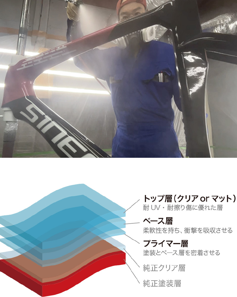 特徴としては、 ①塗装タイプなので、繋ぎ目がなく、複雑な形状でも施工可能で仕上げが非常に綺麗 ②耐UV性、耐酸性、耐薬品性、防汚性に優れているので、酸性、鳥糞、樹液などもしっかりガード ③衝撃吸収性に優れた100μm以上の膜厚で飛び石等による傷を大幅に軽減 ④200℃の高温にも耐える優れた耐熱性 ⑤新車と同等の光沢でオリジナル塗装の質感を維持 ⑥細かい傷は自己修復機能により復元(クリアコートのみ) ⑦塗装のようにポリッシュやコーティングも可能 ⑧オリジナル塗装面を傷つけずに剥がす事が可能 ⑨自転車フレームでわずか約30~40gの重量増で施工可能 ⑩クリアコート、マットコートの選択が可能 ⑪耐久年数はおよそ5年 となります。