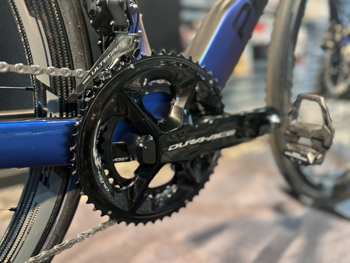 新しいバイクの購入を検討している時に新型DOGMA Fの発表があり、シックなマット塗装で見る角度によって色が変わるマジョーラカラーを気に入った為、このカラーを選択。上品さと大胆さを兼ね備えたデザインに、思わず引き込まれるような美しさがあります。 乗り心地も低速域からの加速がはっきりしており、徐々にスピードに乗ってくると一定の速度域の維持が今までのバイクよりも頑張らずにペダルを漕ぐことが出来ました。 基本コンポーネントはShimano ULTEGRAですが、パッとひと際目を引くクランク部分とブレーキローターにはDURA-ACEのパワーメーターをアッセンブル。全てDURA-ACEで揃えることも考えましたが、あえてここでコストを抑え、見た目もパフォーマンスもバランスの良いセッティングにしました(少し見栄を張った部分もありますが、それもバイクの楽しみの一つです!)。 ハンドルバーには新型DOGMA Fの専用ハンドルであるMOST TALON ULTRA FAST。エアロ性能と剛性を両立しつつ、ケーブル類がすべて内装されているため、すっきりとしたデザインが愛車の洗練された美しさを際立たせています。コックピット周りの操作感も良く、特に高速走行時にその安定感を実感できます。私はコンパクトなハンドルサイズが好きなためブラケットを握った際の心心が360になる42-110をチョイスしました。 ホイールはFULCRUM SPEED40。軽量かつ反応の良いホイールで、ペダルを踏んだ瞬間の加速感が非常に爽快です。40mmハイトということで平坦でも登りでもバランスよく使いやすいです。