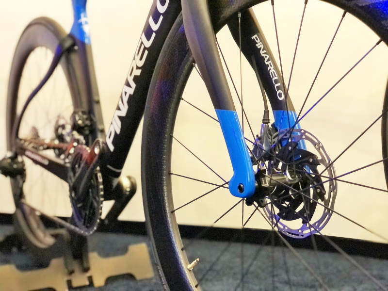リムブレーキはリムを直接挟むことにより制動をしますが、ホイールリムの材質により制動力にバラツキがあり、カーボンホイールを使用する場合は熱によるリムの変形にも注意が必要です。ブレーキを一定間隔で握ったり離したりといったブレーキングテクニックを使用しての運用が一般的です。一方で部品点数が少なく軽量に仕上がることからレースやヒルクライムなど軽さを求めるような乗り方を考えている方にはおススメです。ピナレロを使用する「チームイネオス」もリムブレーキのドグマを使用しております。