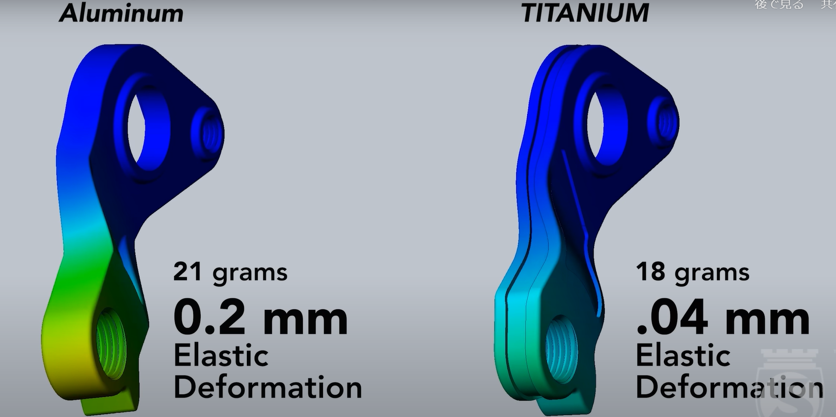 一般的なディレイラーハンガーはアルミ製ですが、SILCAのディレイラーハンガーは3Dプリント技術を駆使したチタン製となっておます。 剛性はアルミ製に比べて、2〜7倍。 加えて、ダイレクトマウントになっている為、パーツのしなりが少なくなり、変速の精度が向上し、ヒルクライムやスプリント時にもその違いを実感できます。 特に電動変速機が増えて来ている昨今、変速時にかかる駆動パーツへの力も大きいため、低品質のアルミで作られたハンガーでは、変速中に最大で4度も曲がることもあり、それに伴い、変速精度の低下につながります。