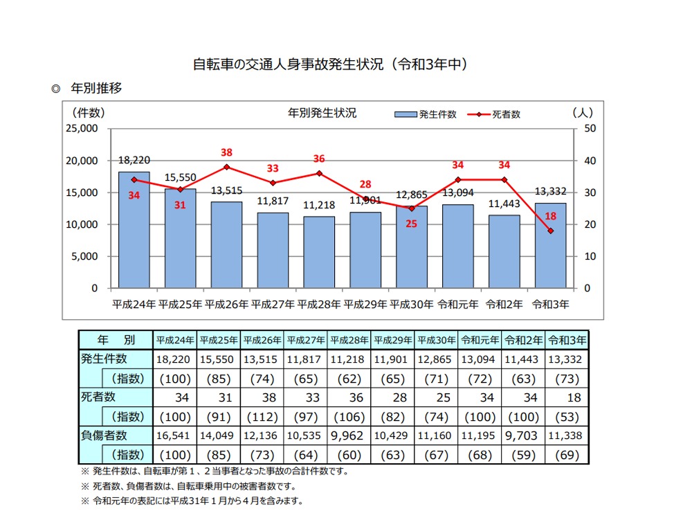上記の画像から令和3年度の自転車交通事故発生数をみてみると、約13300人が自転車での事故が発生していることがわかります。残念ながら私の周りでも年に数件そういった嫌な話を耳にすることがあります。