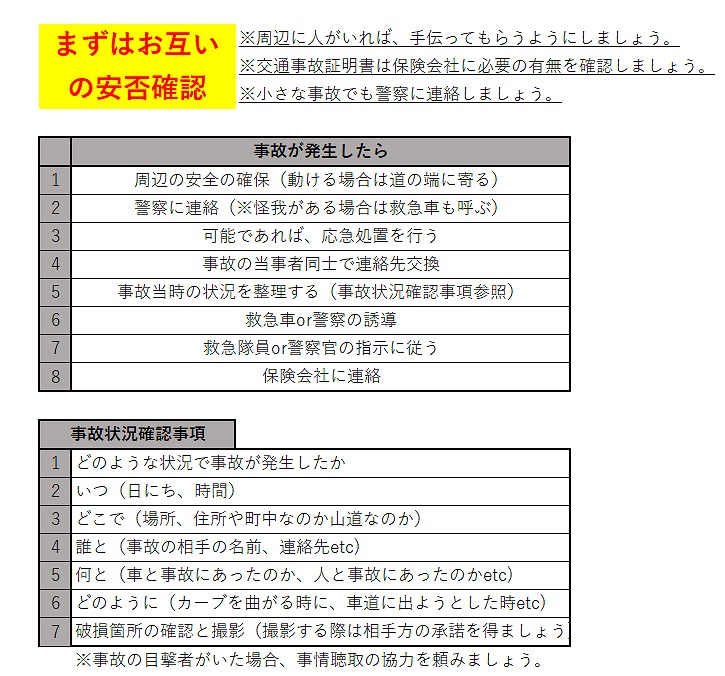 怪我や事故に遭わないことが最も大切なことですが、万が一の際の対応の仕方についてご紹介したいと思います。