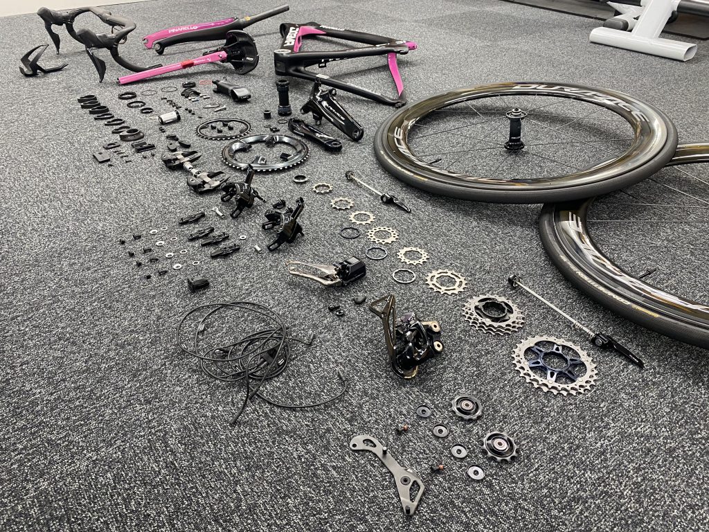 一度ロードバイクをバラバラに分解し、定期メンテナンスでは中々手の届かない部分まで洗浄・グリスアップ、消耗品の交換等を行います。