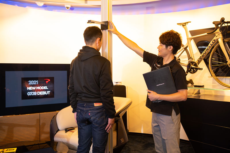 スポーツバイクはサイズ選びとポジションが非常に重要です。ピナレロはエントリーモデルの「PRIMA」でも10通りのフレームサイズをラインナップしております。トップモデルの「DOGMA」ではなんと13種類もサイズがあります。これは自身も年間1万キロ以上走るサイクリストでもあるファウスト・ピナレロの理念に基づきコスト度外視で幅広いサイクリストに最高の形で乗って欲しいという気持ちの表れでもあります。ピナレロショップ青山ではお客様の身体データを測定し、BIKE FIITTENG.COM社のデータベースに落とし込みフレームサイズ候補を選定、こちらの設計図をもとにシミュレーターで実際のポジショニングを再現します。微調整を繰り返しながらご納得いただけるポジションを導き出します。お客様の経歴やサイクリングレベルなどを加味し最終的なサイズ決定のアドバイスをいたします。